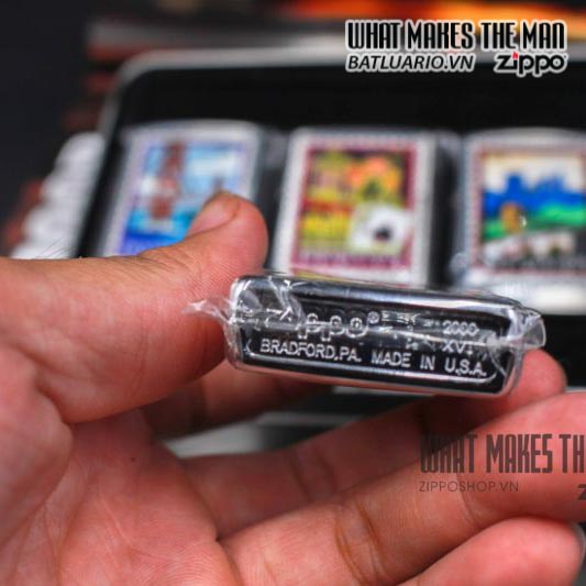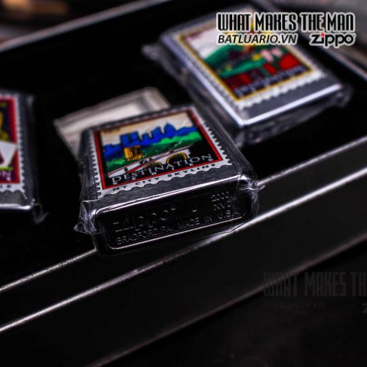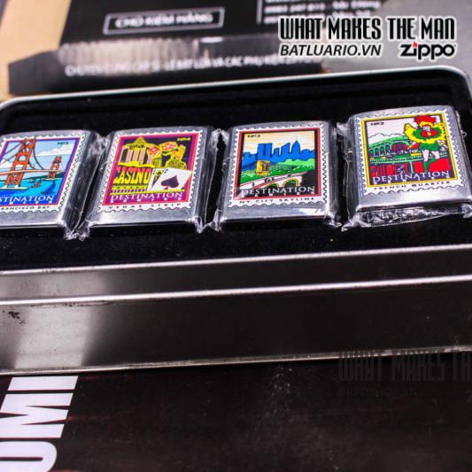 Zippo set ” The Destination” – tạm dịch là bộ tem ( vì nhìn giống con tem ) . Bộ này gồm 4 em zippo tượng trưng cho 4 điểm đến :