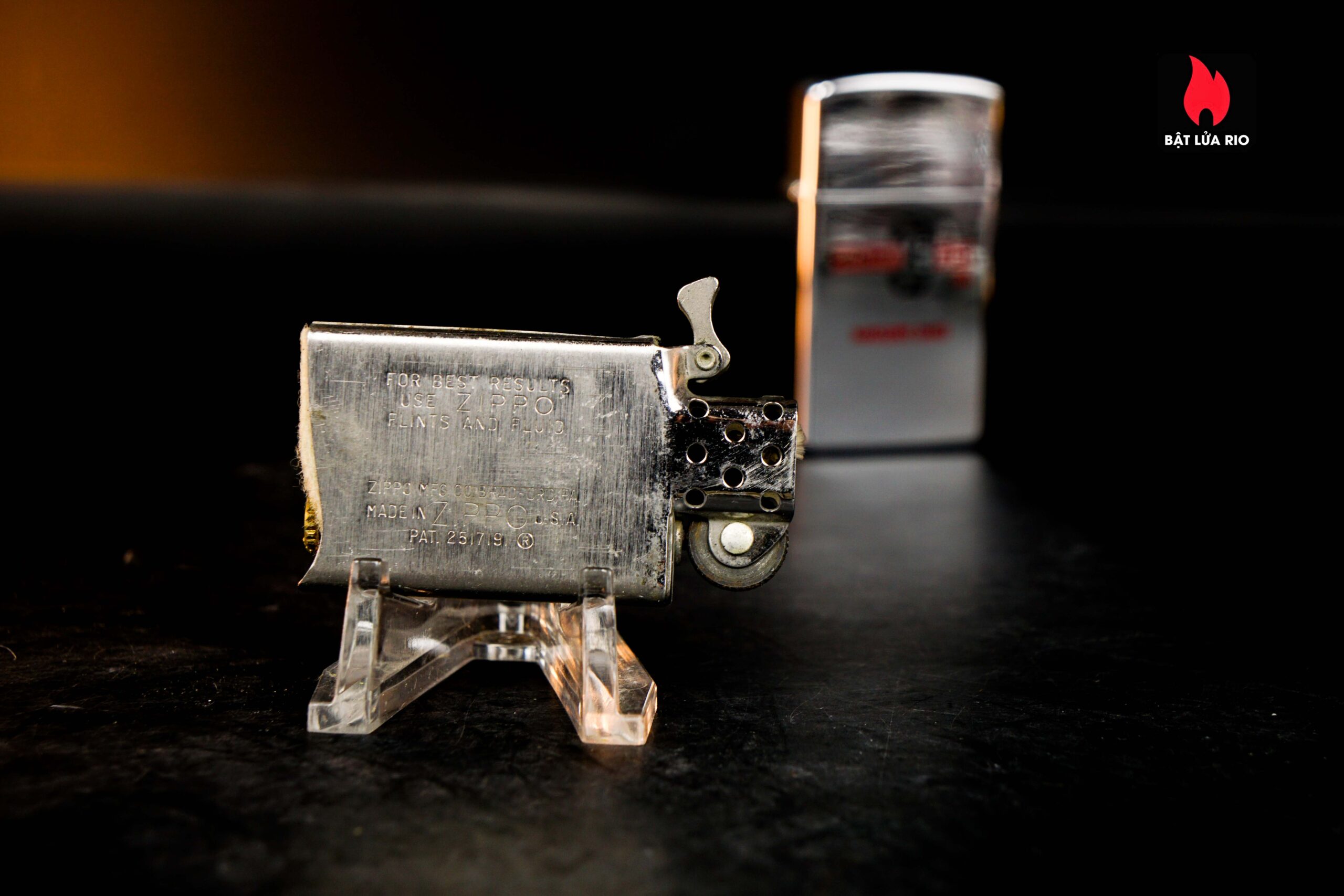 – Zippo trong tình trạng đã qua sử dụng , trầy xước nhẹ cả 2 mặt tuy nhiên hầu như không cấn móp . Mọi chức năng sử dụng đều tốt